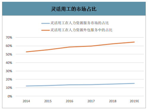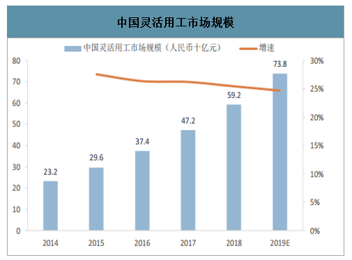2018年我國人力資源服務(wù)市場(chǎng)規模約4085億元,其中人力資源外包服務(wù)市場(chǎng)規模948億元,占比約23%;我國靈活用工2018年市場(chǎng)規模約600億元,占總體人力資源服務(wù)市場(chǎng)的14.5%,在人力資源服務(wù)外包的比例超過(guò)60%,2014-2018年我國靈活用工市場(chǎng)規模年化增速約26.4%。前面我們有介紹過(guò)《中國“靈活用工”人口基數達2.4億人 服務(wù)商滲透率不足1%》,文章中簡(jiǎn)要概述了靈活用工在國內的發(fā)展。