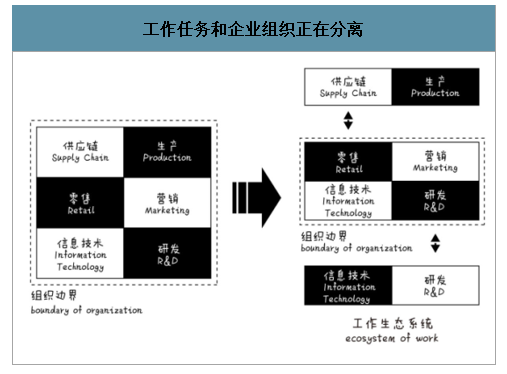人天性自由,靈活用工存在著(zhù)天然成長(cháng)土壤。從歷史發(fā)展進(jìn)程來(lái)看,組織化工作并不是天然發(fā)生的,而是人類(lèi)希望在組織中尋求保障的生存需求所驅動(dòng)的。狩獵時(shí)代和農業(yè)時(shí)代時(shí)期,為應對艱苦的自然生存環(huán)境,人類(lèi)加入群體團體作戰,日出而作日落而息。工業(yè)時(shí)代,為提升生產(chǎn)效率,形成組織、為一個(gè)組織工作、精細化分工成為社會(huì )主流。如今步入信息時(shí)代、生物科技時(shí)代,物質(zhì)資源的極大豐富使得人類(lèi)的生產(chǎn)和生活方式發(fā)生了翻天覆地的變化,工作的性質(zhì)也發(fā)生了變革,企業(yè)的邊界正在日益模糊,去組織化進(jìn)程日益明顯。